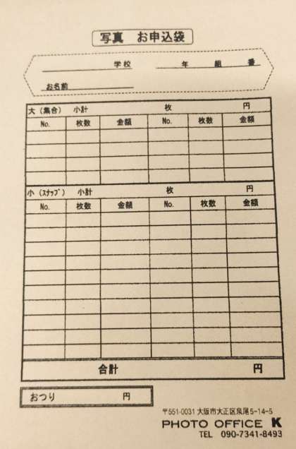 購入される場合は、本日配布した封筒に必要事項を記入しお金を入れて17(木)の登校時(8時10分〜25分頃)に写真屋さんに渡してください。