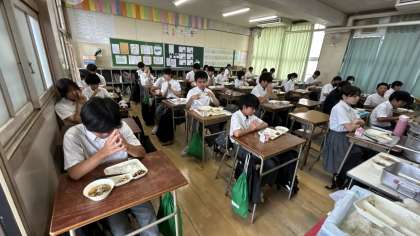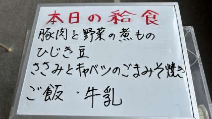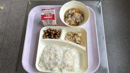今日の給食は、豚肉と野菜の煮物、ひじき豆、ささみとキャベツのごま味噌焼きです。
