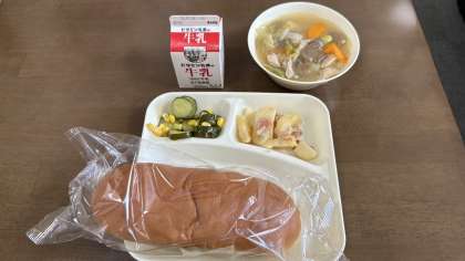 今日の給食は、鶏肉と野菜のスープ煮、ジャーマンポテト、きゅうりとコーンのサラダです。パンは黒糖パンです。
