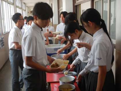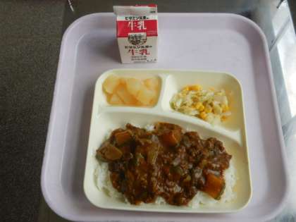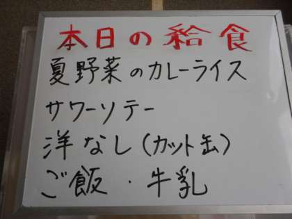 今日の給食は、夏野菜カレーライス、サワーソテー、洋ナシ(カット缶)です。