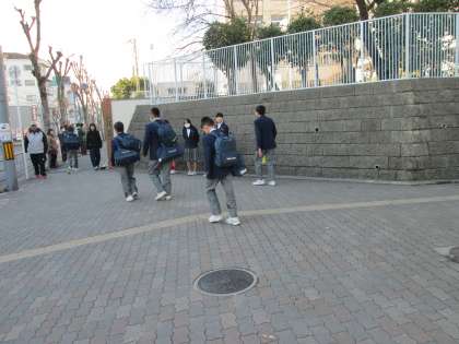 風が強く、とても寒い中、生徒たちが登校しています。