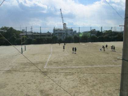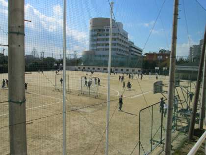 風が冷たい中、生徒たちはグラウンドに出てボール遊びを。