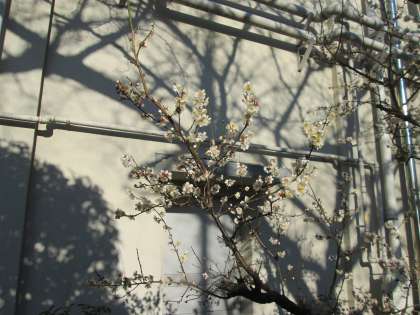 太陽の光に映える白梅。