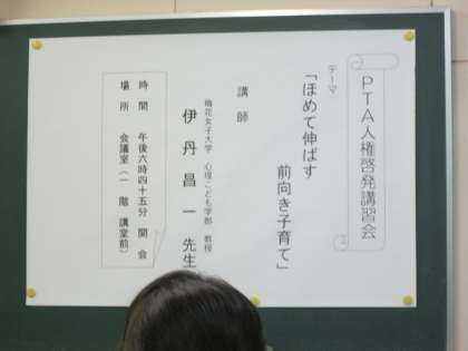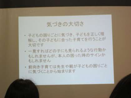 「ほめて育てる前向き子育て」というテーマで、子どもとのふれあいのポイント、気づきの大切さなど、大事なキーワードをご指導いただきました。