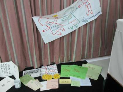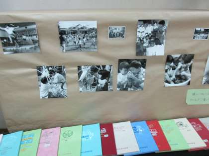 その後の周年祝賀会の冊子や記念タオル、当時の写真やアルバムがたくさん展示されています。
