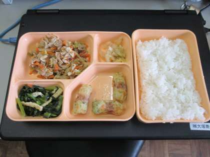 「豚肉の甘辛炒め」「ちくわの磯辺揚げ」「小松菜の煮びたし」「白菜のごまあえ」というメニューです。