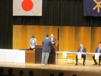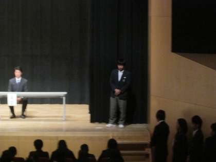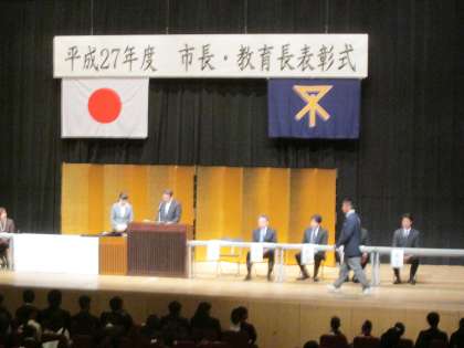 司会者から名前を呼ばれ、教育長様から学校名・名前と、「おめでとう」のお声をかけていただきました。