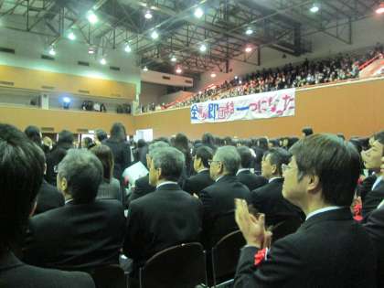 在校生の合唱「エール」の中を、担任が先頭で、涙ながらに去って行きます。