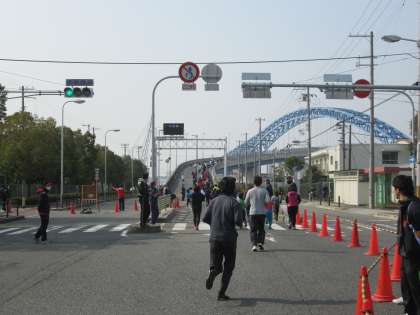 そして、千歳橋に。この時間、車両が規制され、選手は橋の車道を登って行きます。