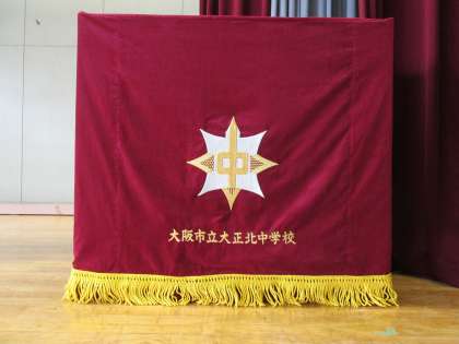 エンジ色の光沢のある生地に、校章の刺繍が光ります。