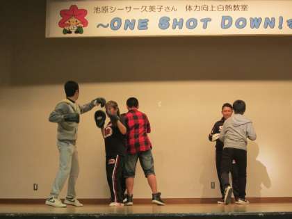 最後は舞台上で、グローブをつけさせてもらい、ミット打ちです。