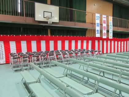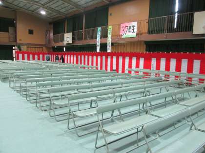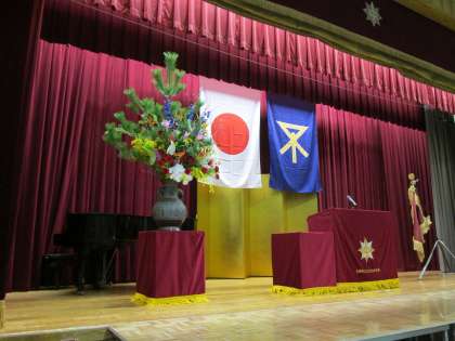 金屏風をバックに、国旗・市旗。両サイドの豪華なお花と校旗が。