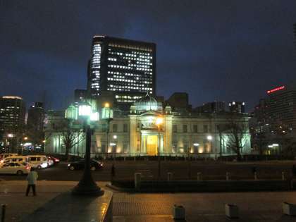 しかし、そこには幻想的なシルエットが! 重厚な建物である日本銀行のライトアップです。