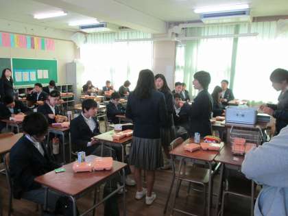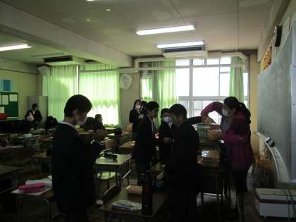 1年生は給食準備中です。
