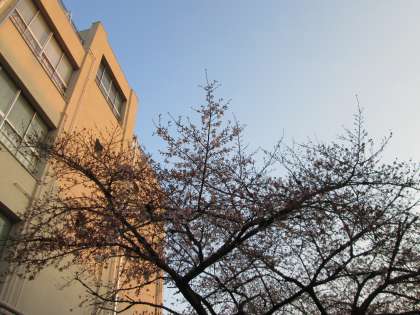 正門の桜も、全体的にほのかなピンク色に。一分咲きでしょうか。