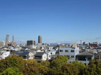 大阪ドームや、弁天町の高層ビルの奥に、北摂の山々がクッキリと!