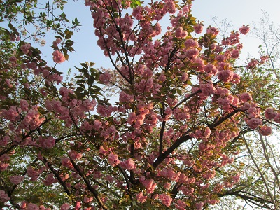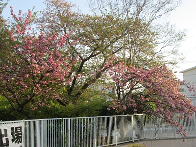 正門の八重桜は、ついに満開を迎えています。これから生徒たちの学校生活も花開くことを願います。