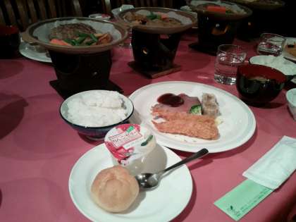 ローストビーフ、エビフライ、ハンバーグの他に、サラダやたこ焼きのバイキングも