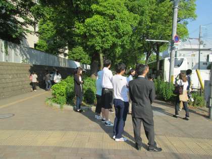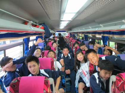 正門を出て、たくさんの先生方や保護者に見送られながら、バスは出発しました。