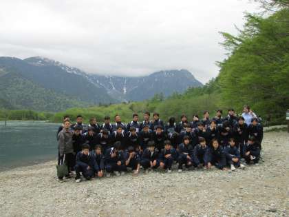 穂高と大正池をバックに