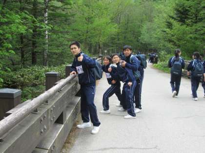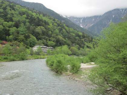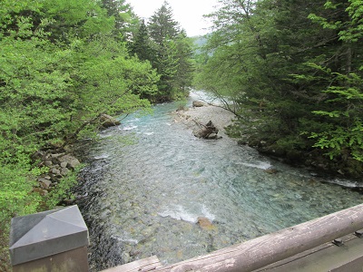 穂高と木々の緑、透明な梓川。ここに青空があれば、完璧です。
