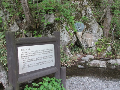 この上高地を世に知らしめ、ヨーロッパのアルプス山脈の名前を取って、「日本アルプス」と名付けた、登山家ウエストンさんの石碑に出会いました。