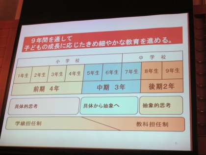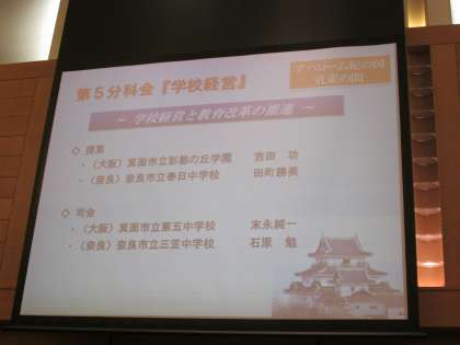 最初の報告は、箕面市立彩都の丘学園の発表で、小中一貫校として新設され、9年間を通した取り組みが、創意工夫をふんだんに取り入れた中味となっていることを報告されました。