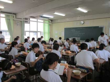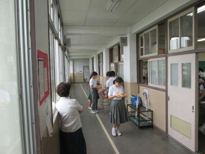 2年生では、廊下を使って配膳をしています。