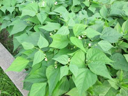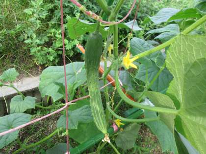 大きなキュウリに、小さな花をつけたサツマイモ。