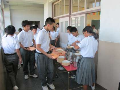 配膳台を使っての、2年生の給食準備です。