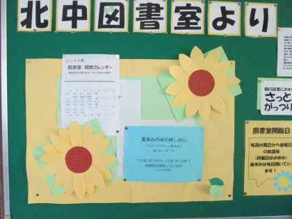 図書室の掲示物が、アジサイから夏のひまわりに変わりました。