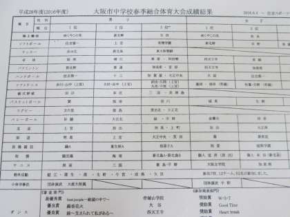 6月に決定した、大阪市中学校春季総合体育大会の成績結果が送られてきました。