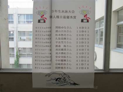 先日行われた水泳大会の、個人レース結果が張り出されました。