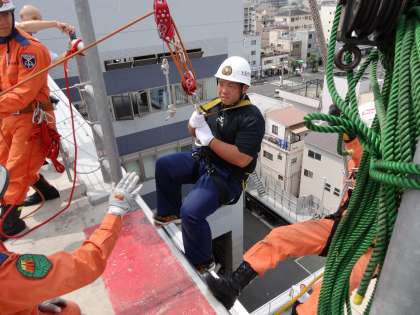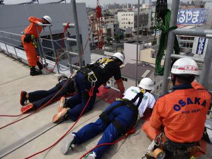 かなりの高さからロープを頼りに下り、人を救います。