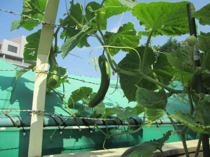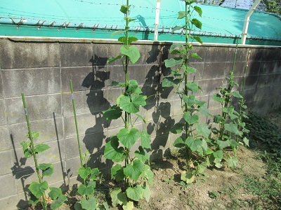 プール横の畑。ちょっと見ない間に背丈は伸びて、美味しそうなきゅうりが実っています。