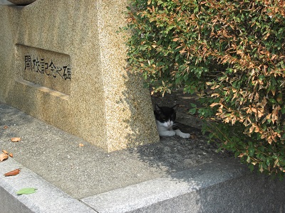 開校記念碑の裏で、猫が休んでいます。
