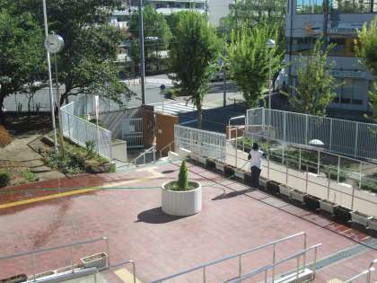玄関ピロティ—では、PTA実行委員さんが水やりを。