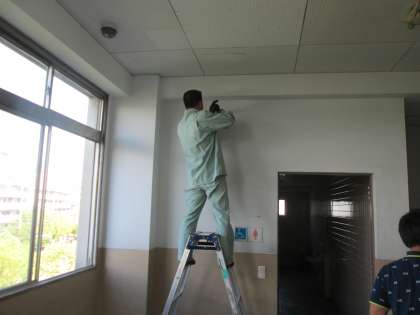 管理作業員さんが、ドリル片手に脚立に乗って!