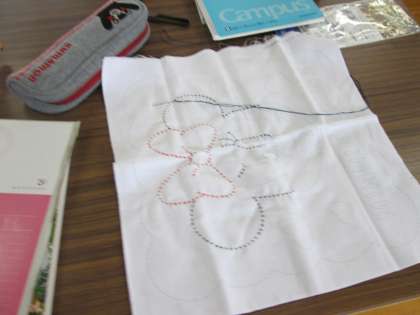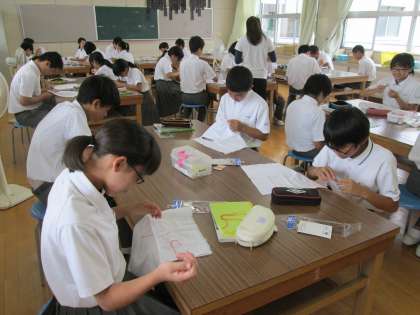 被服教室での授業。ふきんのキャラクターを縫っています。