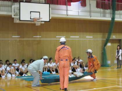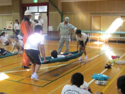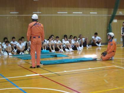 大正消防署のオレンジ軍団が、ていねいに指導されています。