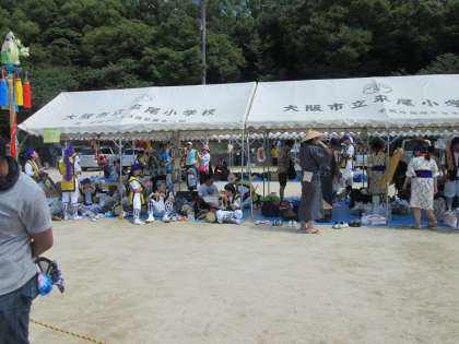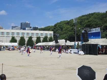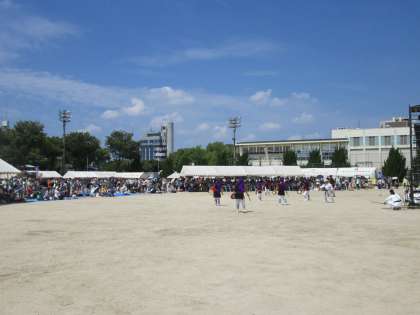 舞台を中心に、大勢の観客がエイサーをご覧になっています。