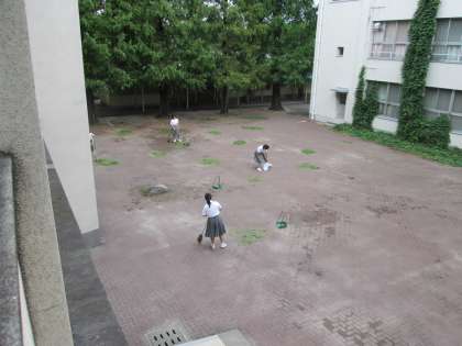 昨日の台風で散乱した樹木の葉や実を、管理作業員さんや部活動の生徒たちがきれいにしてくれました。