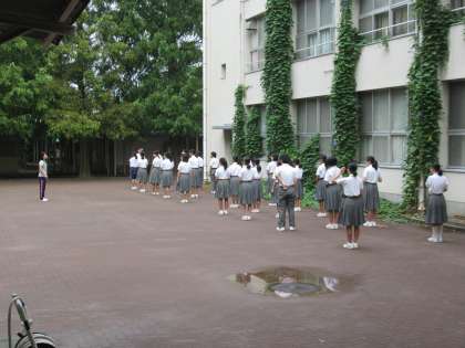 吹奏楽部は、中庭で入場行進のマーチング練習を行っています。