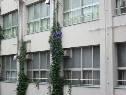 校舎の樋(とい)づたいに、成長し、綺麗な花をつけています。