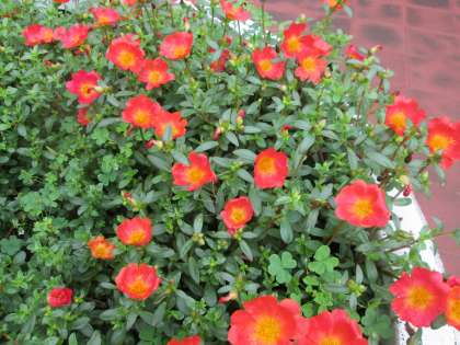 玄関ピロティ—の赤い花も、太陽の光と同時に花が開いていきます。