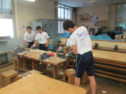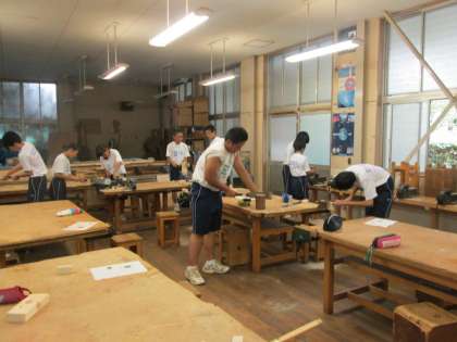 2年の技術の時間。木製のペン立てづくりにチャレンジです。