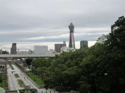 上町台地の高台に立ち、通天閣など大阪の町が一望できます。