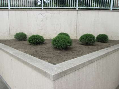 正門の植え込み。管理作業員さんの手によって、古い樹木の伐採から、新しい樹木の植え付けまで、キレイに仕上げていただきました。