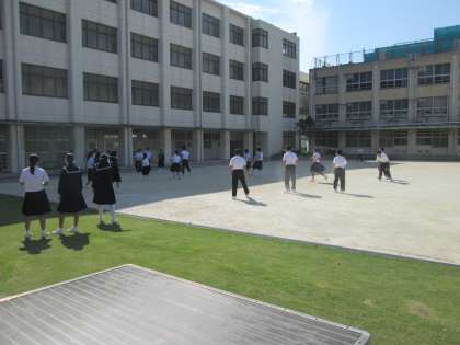 英語の公開授業を控え、運動場で遊ぶ生徒たち。