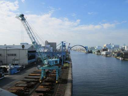 大きなクレーン、コンテナバース、水門が、力強く感じます。